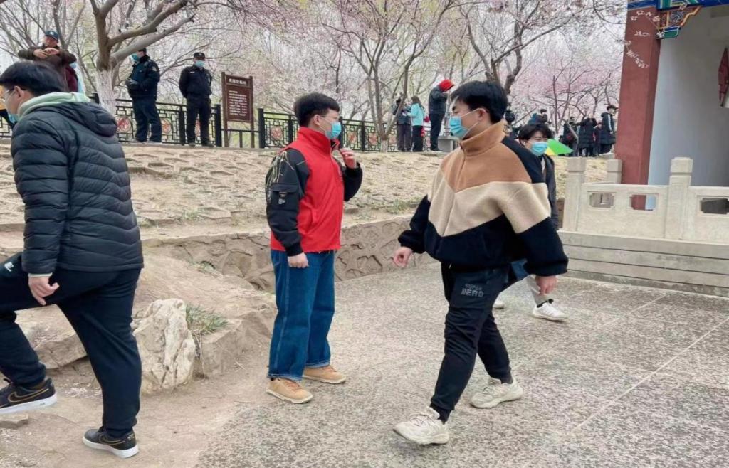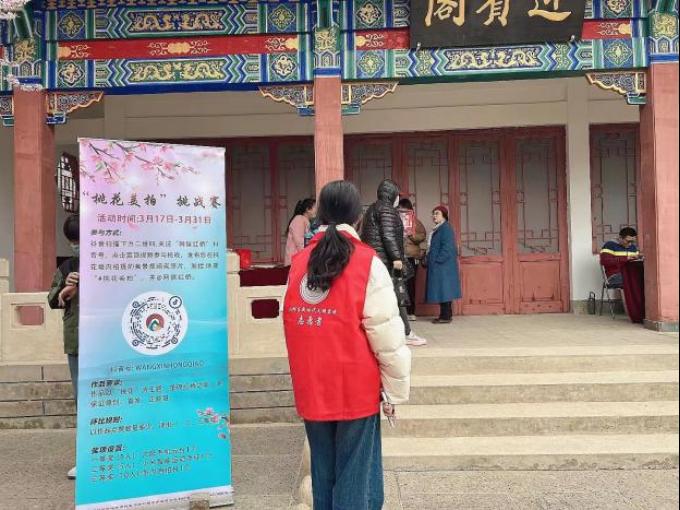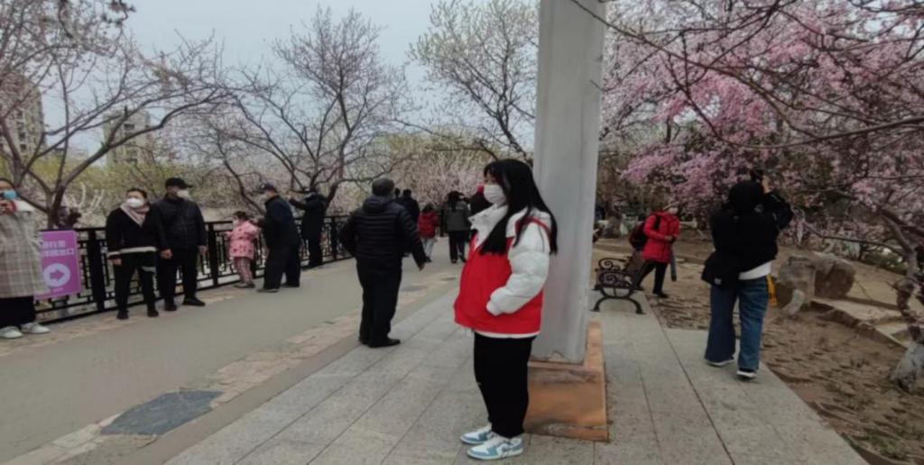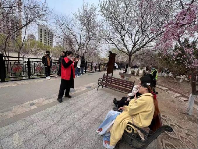 志愿者们来到红桥区桃花园,协助工作人员进行“汉服十二花神展”、“非遗展”两个点位的准备工作。活动开始后,现场通过天津发布微博、天津发布微信视频号、津云app等平台进行了同步直播。志愿者们也充分发扬“主动干精神”,积极维护外围秩序,随时观察直播进行情况,引导群众观赏路线,在保障大家人身安全的同时,让市民朋友们都沉浸在诗意灵动的粉红花海的美景中,解锁吃喝玩乐一站式享受。